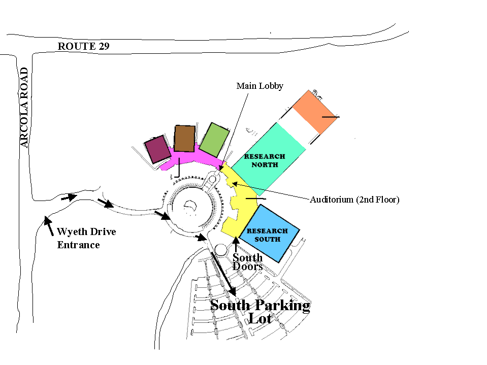 Note that the entrance to the Wyeth Collegeville facility has 3 flag poles. Once you have turned into this main entrance, continue ahead through the open lever-gate. Continue to drive past the Visitors Circle, which is located to your left. As you proceed slowly past the pedestrian crossing (the slightly corrugated pavement), make an immediate left turn into the South Parking Lot. Park at any unmarked or non-reserved space. You'll need to add an extra 15 minutes to your traveling time for parking and getting to the Auditorium.